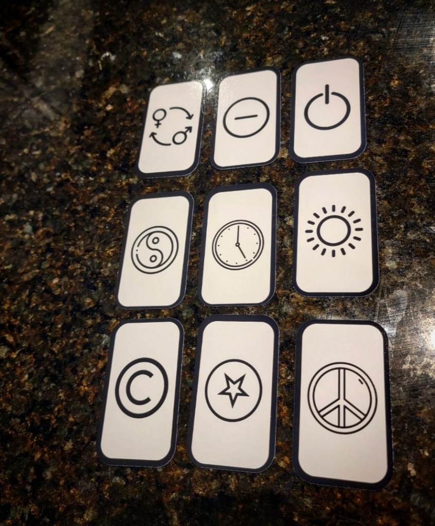The first part of the game is light and fun. You place the black cards in a grid symbols facing up, and spend a minute memorizing the cards. Literally a minute, as the rules state. We found it a little too easy to memorize cards with 60 seconds, so instead we made a house rule of 30 seconds and this increased the difficulty of the game a healthy amount.