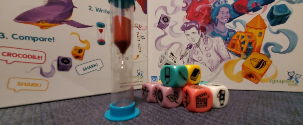 To play, you roll your dice and place them on category cards. When the timer starts, you have 3 minutes to write down a word or few that connect each card to one another. The write-in sheet has a handy color guide that makes it easy to keep track of what connections you need to make.