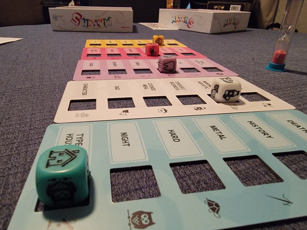 Quality: Clean and nice. The dice having the ingrained images makes the images last, the category boards are thickly cut, and the sheets are good quality paper. You do unfortunately have to supply your own writing utensil. We wished it came with a set of pencils as other roll and writes usually do, but it wasn’t a deal breaker!