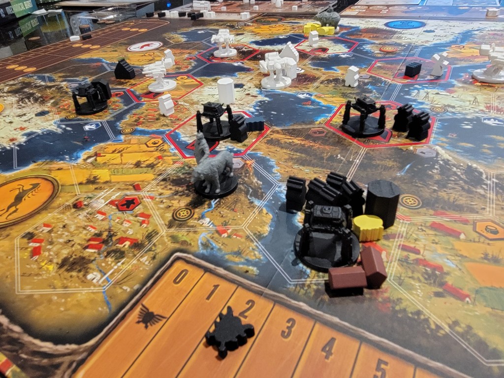 Game turns are fairly standard, kind of short especially in the beginning. However, since there is much to accomplish and each turn allows you to do a tiny bit at a time, the game does end up being long. It takes about two and a half hours to play. Sometimes you notice the time, other times it goes by like nothing. Sometimes a turn will be very quick and others you have to take your time to think about what other players will do.