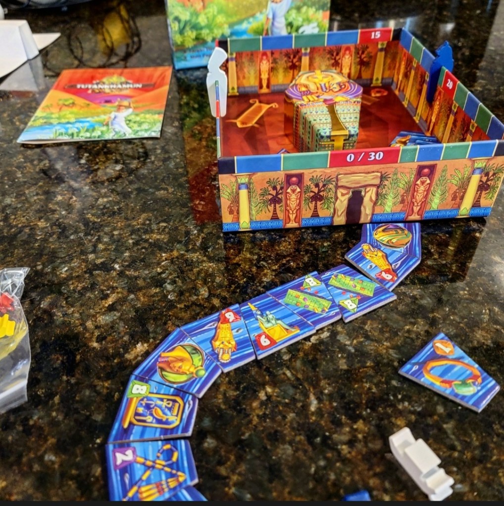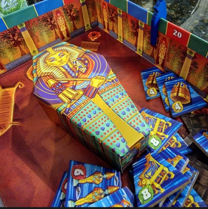 Artwork: Perfect for the theme. We really loved how the tomb was in the game box and a pharaoh sarcophagus sat in the middle. The river design is both aesthetic and functional as well. There is great use of gold and blue tones in the game.