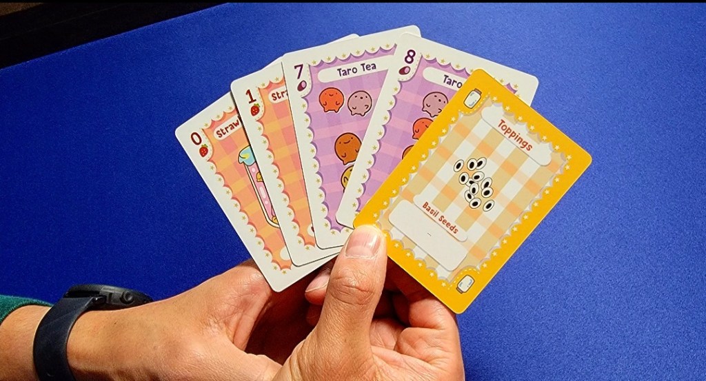 There are various ways you can complete your sets. You can go for straights, color matching, different colors, collecting topping bonuses, and/or number matching. All the rummy mechanics. However, the boba theme doesn’t feel like just a recycled reskin on a classic, the game genuinely makes a name for itself. The game just utilizes an easy to memorize scoring mechanic!