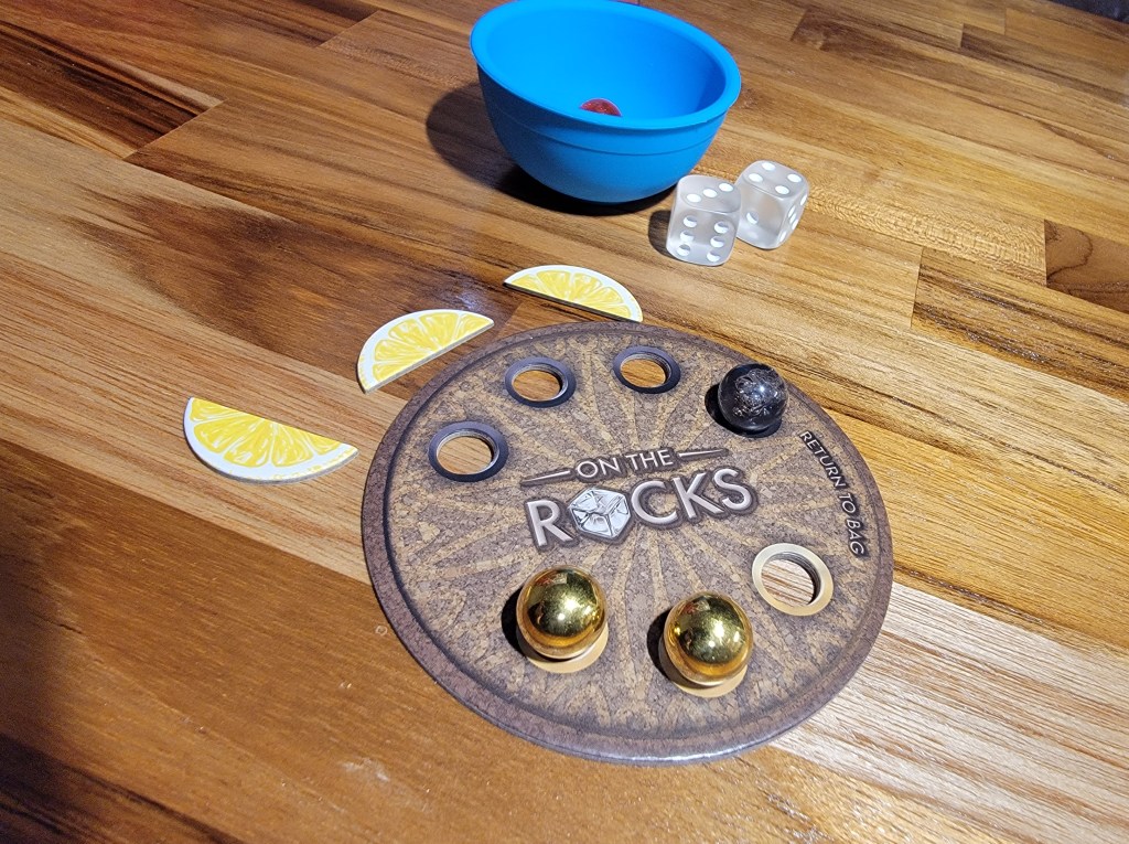 Set up is easy but a little involved. You have silicon jiggers that hold marbles and drink cards for 4 types of glasses (old fashioned, hurricane, martini and highball). Depending on the player count you set up the appropriate number of marbles (which are cocktail ingredients), jiggers, and play mats. You have a handy little coaster that holds spill marbles and premium marbles as well. Overall you have a very busy looking game that is well organized by the great player mats, jiggers, marble bag and coaster.