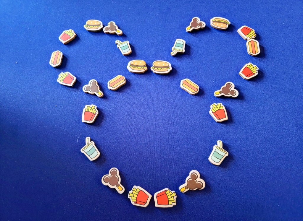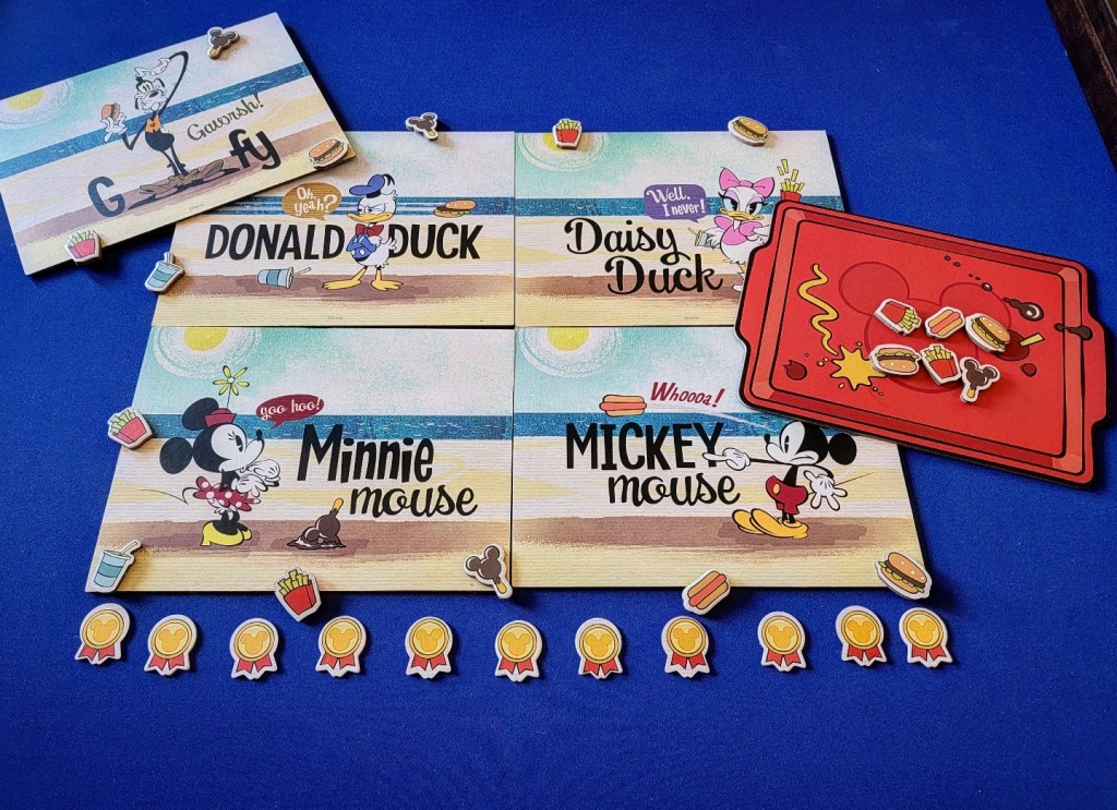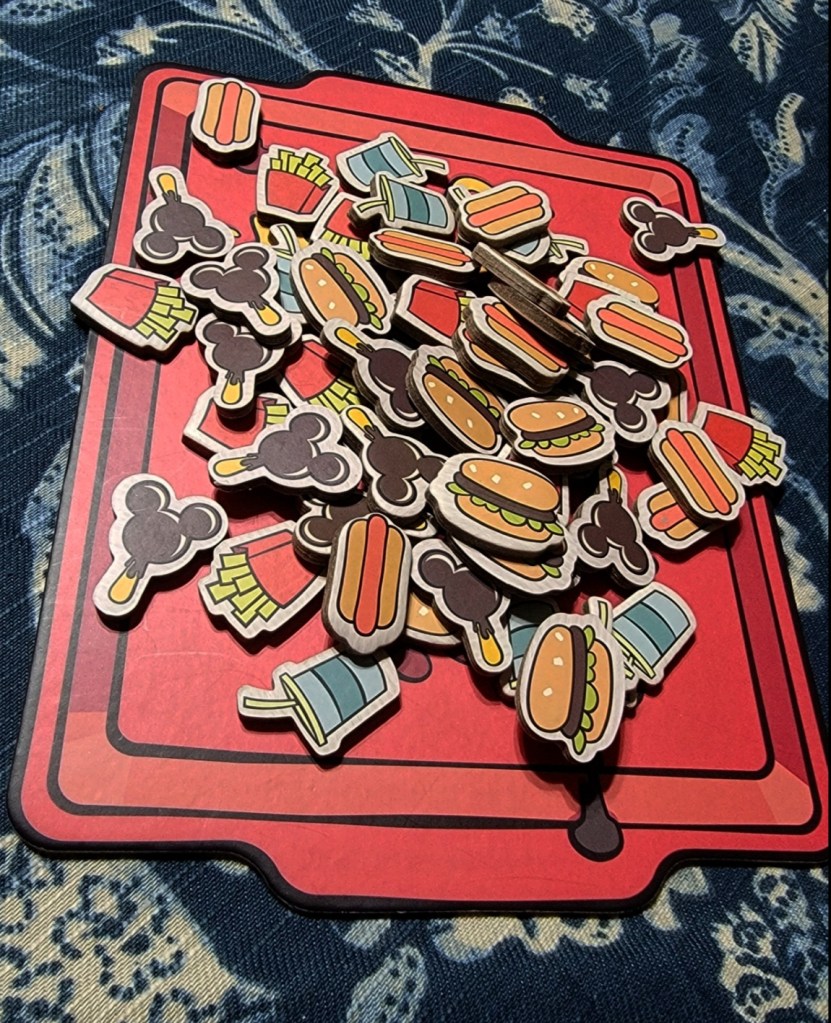 The amount of food you start with depends on player count (and if a child is playing they get less to start with). The food items (Mickey ice cream, hot dogs, hamburgers, sodas, and fries) are thick tokens and very sturdy. You can organize them on your plate to start but be prepared that the plates will get messy!