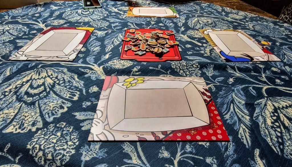 The main version of the game is fun but we actually thought the alternate version was even more hectic and competitive where food needs to be collected from the center tray and stolen from other players. The most food on a tray wins. We played with a small tweak to the rules for this version. Normally you begin with a token of each food type but for extra difficulty we played ours with nothing to start and being able to take only from the center until it is possible to steal from other players. The hardest part of this version is at the beginning when the only option to take from is the tray and the goal is to roll the tray side on the die. Then once other people get food on their trays you can start stealing their precious food.