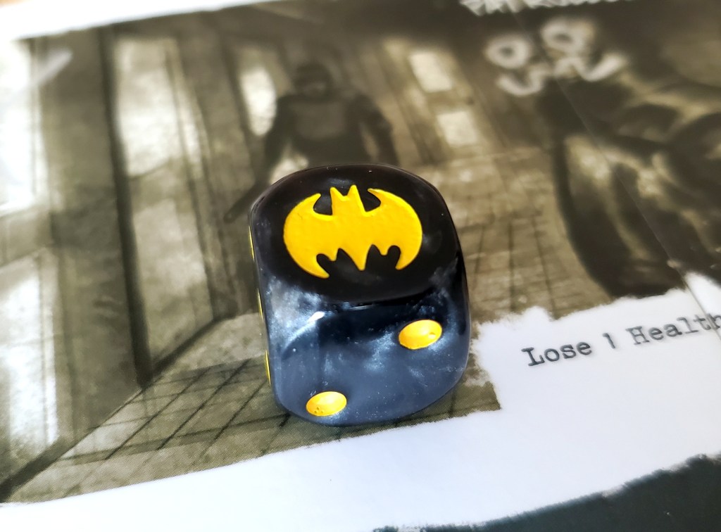 Quality: Excellent. Each character has their own card and miniature that is well detailed. Cards are textured and the board is an enormous sprawling map. The dice are black and yellow and the custom Batman side is both thematic and serves as a reminder that he must move when rolled.