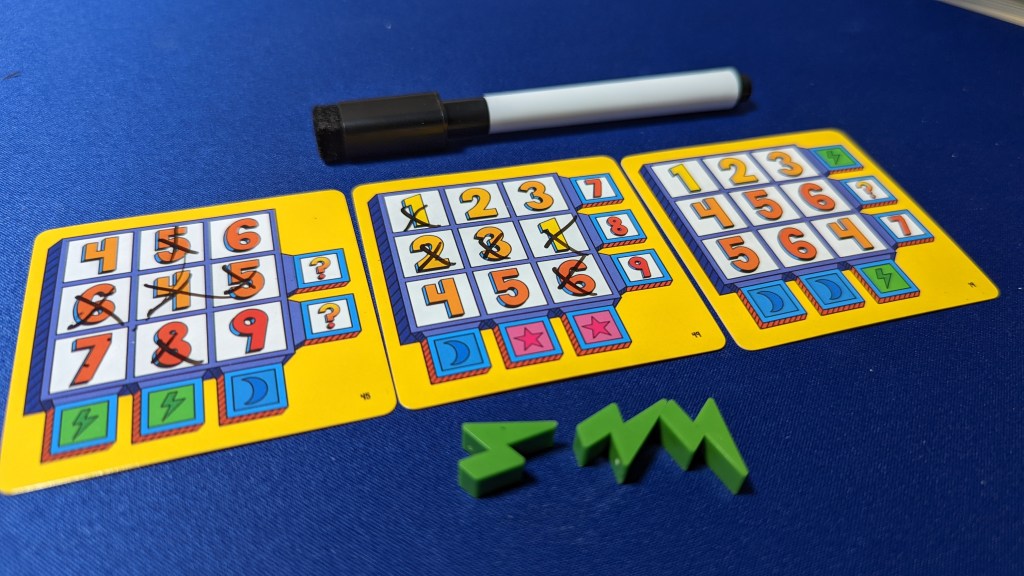 In the Super Mega Lucky Box… box you will find the rulebook, dry erase markers with eraser caps, Super Mega Score Cards, Lucky Box Cards, lightning bolts, moons and 18 number cards (numbered 1-9 twice). The components are easily stored and the cards are of sturdy quality and are easily erased (which is very important for a dry erase card). Being avid board gamers we always appreciate when a game is packaged in as little space as possible to save shelf space. The markers write well and the erasers on the caps are always appreciated, saves a little time and makes it less likely to accidentally lose wipes that sometimes come separately. The moon and lightning bolts are hard molded plastic and while you can see where the pieces are cut off the mold, it does not affect gameplay and is minor.