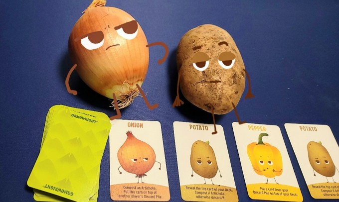 The non-artichoke vegetable abilities can help you get rid of artichokes but they can also help your opponent. The onion lets you compost an artichoke (composting being a separate discard pile that all players share separate from your individual discard pile). Then you have to put the onion on an opponent’s individual discard pile, giving them the opportunity to use this card in the future when they reshuffle their discard pile to become their available deck to draw their hand from.