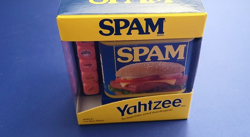 We were sent SPAM and Cup Noodles editions of YAHTZEE for review by The Op. These are the same classic game in a new packaging style. Each game comes with 5 six-sided die and a container to shake the die in. We are always up for any game that has a good food theme attached to it. This review will focus a lot on imagery since that is what makes the game differ from its original version.