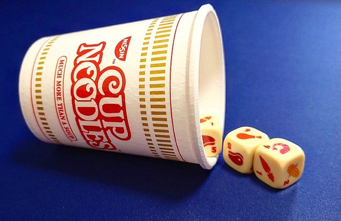 Artwork: That is the epitome of what makes these worth buying — yes, it is the classic game, but they did such a good job making the containers and die have a fun design. The only criticism we have of the artwork is that we were disappointed that neither the ramen cup or the SPAM had lids. The SPAM is also yellow rather than metallic but still the label is perfect.