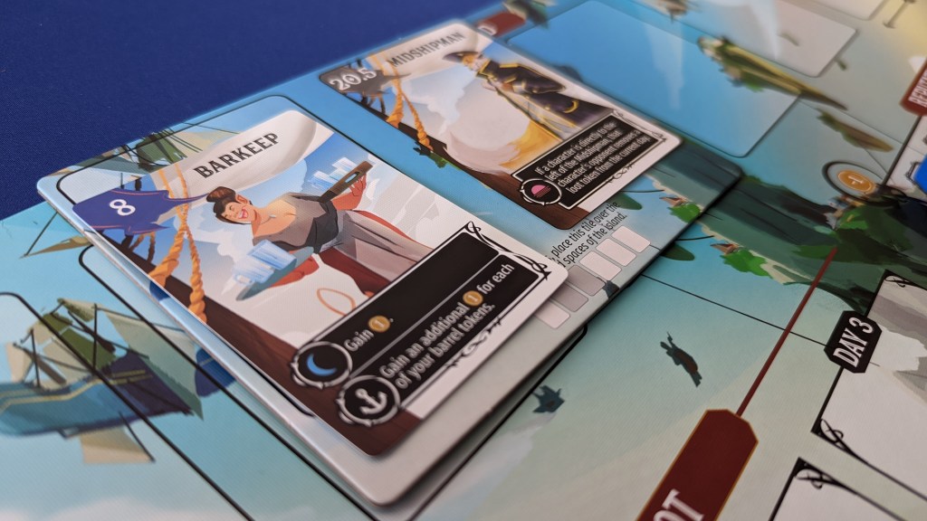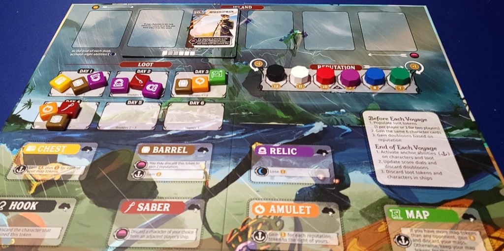 Gameplay is split up into Daytime, Dusk and Night. During each turn each player selects a card from their hand and all cards are revealed at the same time. They are ranked in ascending order from left to right with any ties resolved by the reputation tracker(the player with the higher rank will count as a “higher” card). Then starting with the leftmost character(the lowest ranking card), the card’s ability is activated if it is a Daytime ability (marked by a yellow sun icon). These cards do various things from switching places with another card to taking loot from the voyage. Once all Daytime abilities are activated, Dusk begins.