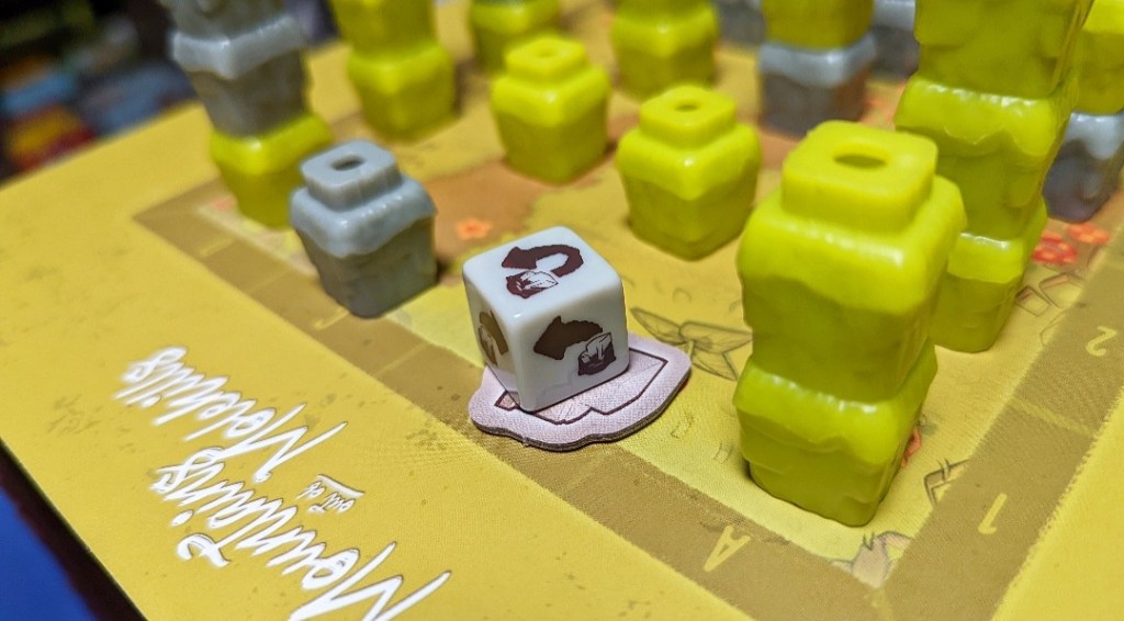 Every time your mole moves underneath a space, it will dig up dirt above it, causing your hills to grow from the bottom up. So taking a forward movement of 3 will mean that you will place 3 molehills at the bottom of any spaces you moved through. The bottom-most piece will determine who controls the molehill and the person who controls the molehill at the end of the game will score points. So your goal will be to have the biggest and tallest molehills under your control. As the mountains grow taller and taller, eventually they topple over. The topple limit is determined by the round. To topple a mountain first you must reach the topple limit and then select a direction in which the mountain will topple. The fall must be orthogonal and as the mountain falls, it leaves its pieces one by one on the spaces in its direction. So if the topple limit is 5, the top 4 pieces “fall” on TOP of the 4 spaces in the orthogonal direction of your choice. They fall on top making any spaces taller without changing who controls the mountains. In this way it may affect other players points as you may inadvertently give other players taller mountains.