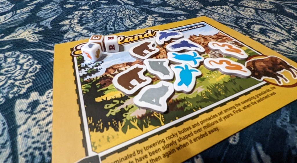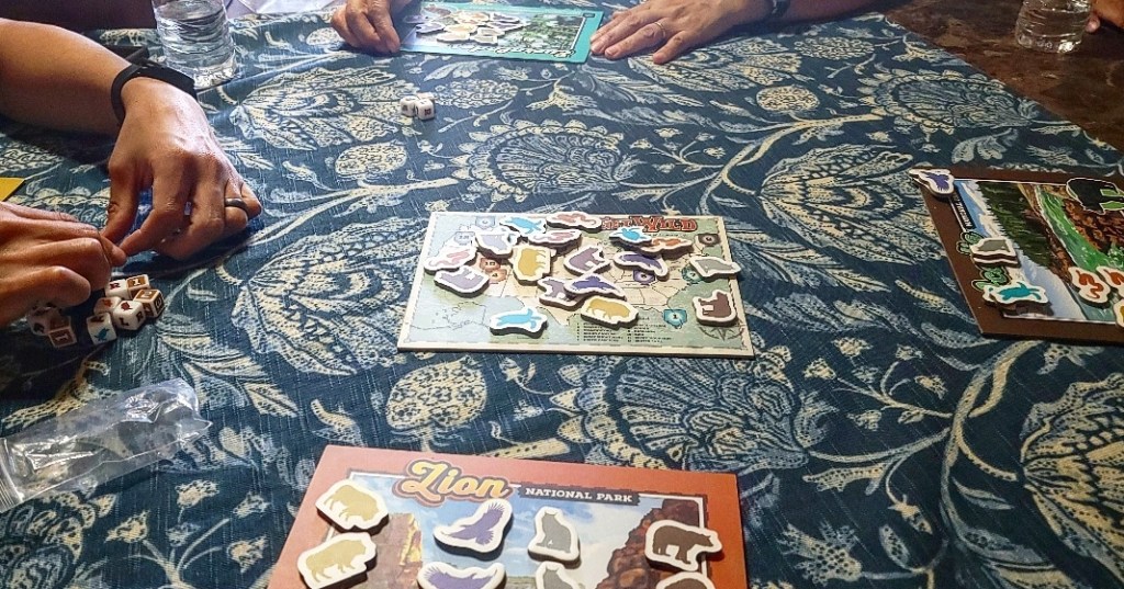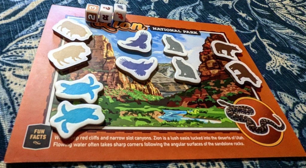 The gameplay variations are very considerate. There is a Junior Rangers version which allows kids to skin using the Quantity dice so they can just move as many of one animal type as they can in one roll. There is also a Family Vacation variation that involves the player board being moved to the next player whenever a 3 and a Left or Right is rolled. In that variation, the first player to have only native animals wins the round and two points wins the game.