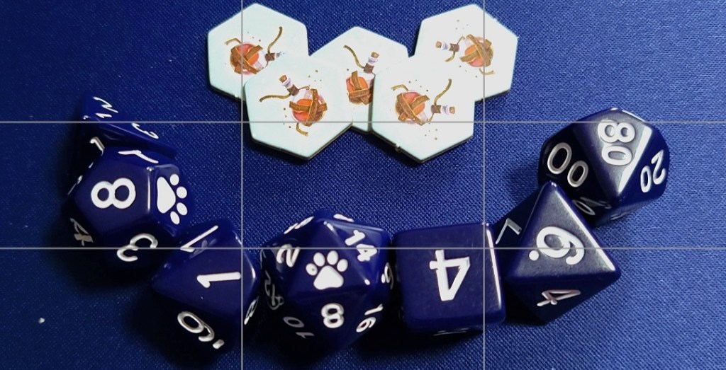 The set of custom dice is very well made. It is a set of 8 purple-blue dice with the highest roll on most dice replaced by a paw print. A d4, d6, d8, d12, two d10s and two d20s. All beautifully crafted and incredibly cute and exciting to roll high.