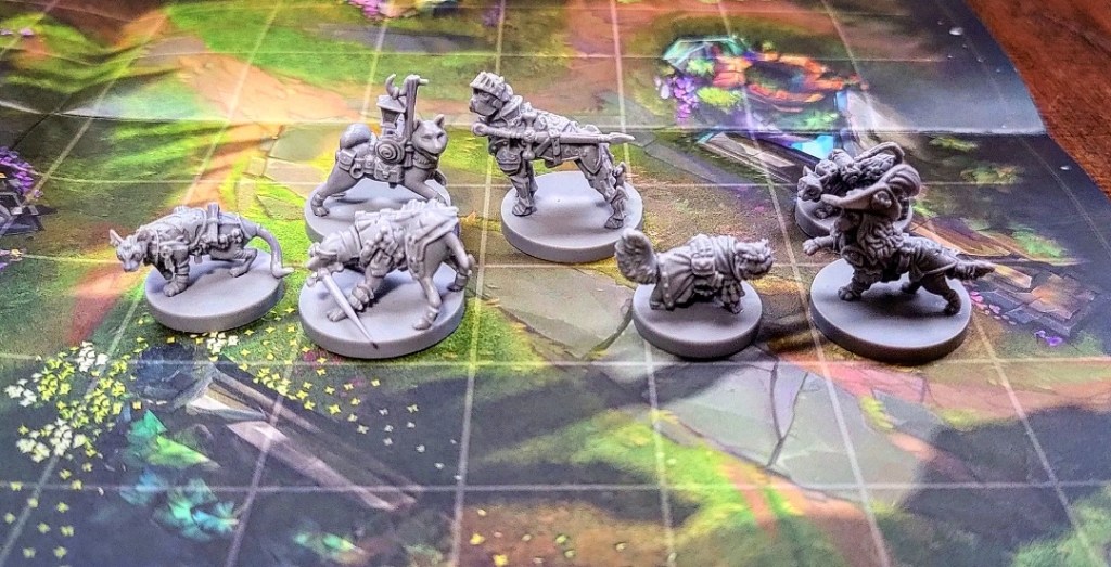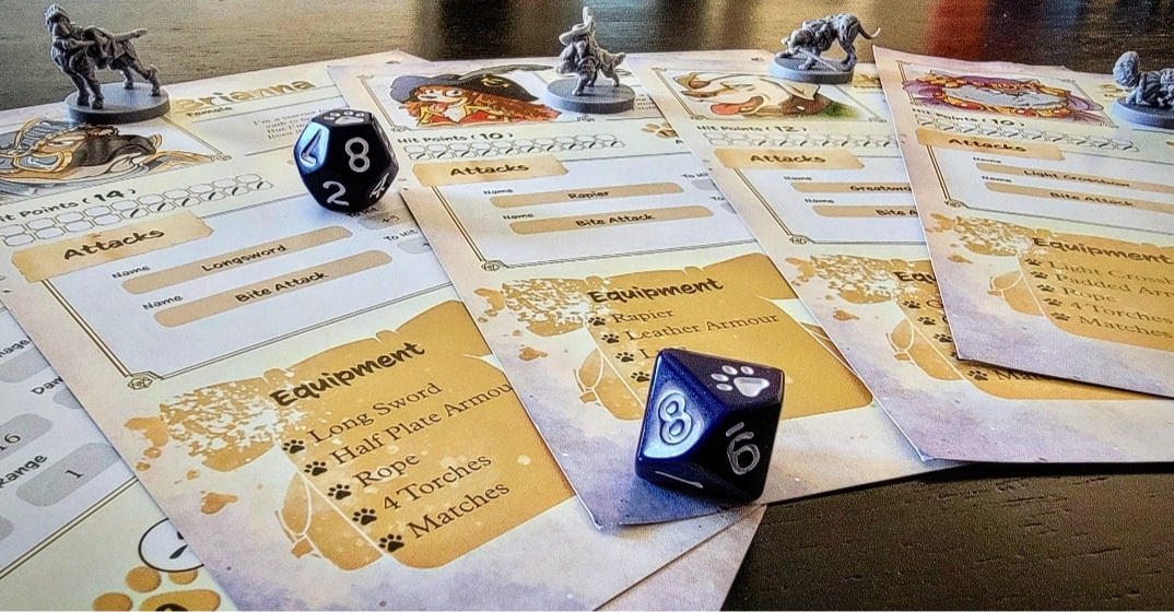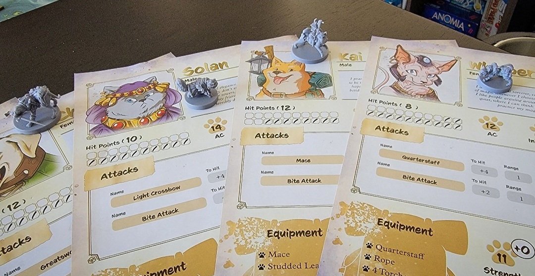 Upon opening the box you find yourself immediately excited to find the miniatures. Steamforged is known for their highly detailed minis and Animal Adventures does not disappoint. With a Cavalier King Charles Spaniel Bard, a Boxer Paladin, a Labrador Retriever Fighter, a Sphinx Sorcerer and more to choose from. The starter set itself comes with 7 pre-built characters; 4 dog breeds and 3 cat breeds. Each character comes with its own miniature and character sheet filled with a backstory, pre-built stat blocks, abilities and a cute little picture of what they look like. The character sheets are incredibly simple, making it very easy for beginners to get into the massive world of RPG’s and Dungeons & Dragons.
