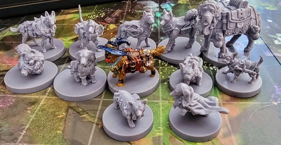 The Dungeons and Doggies Vol. 1 and Vol. 2 come with even more miniatures to allow for more breeds to join in on the adventures. Included in these are Cornelius the Golden Retriever Wizard, Tedric the Chihuahua Rogue, Svetlana the Beagle Barbarian, Tobias the Corgi Warlock, Monty the Spaniel Bard and many more. In total the two volumes span 12 breeds and 12 classes. There are pre-built character sheets that are available for download in the Steamforged resources page but they do not come in the boxes for either volume. The miniatures are all very well made, highly detailed and can be painted very easily. The figures hold onto paint very well without need for being primed first. They immediately take on paint and will take inks once painted as well, allowing for shading and highlights.