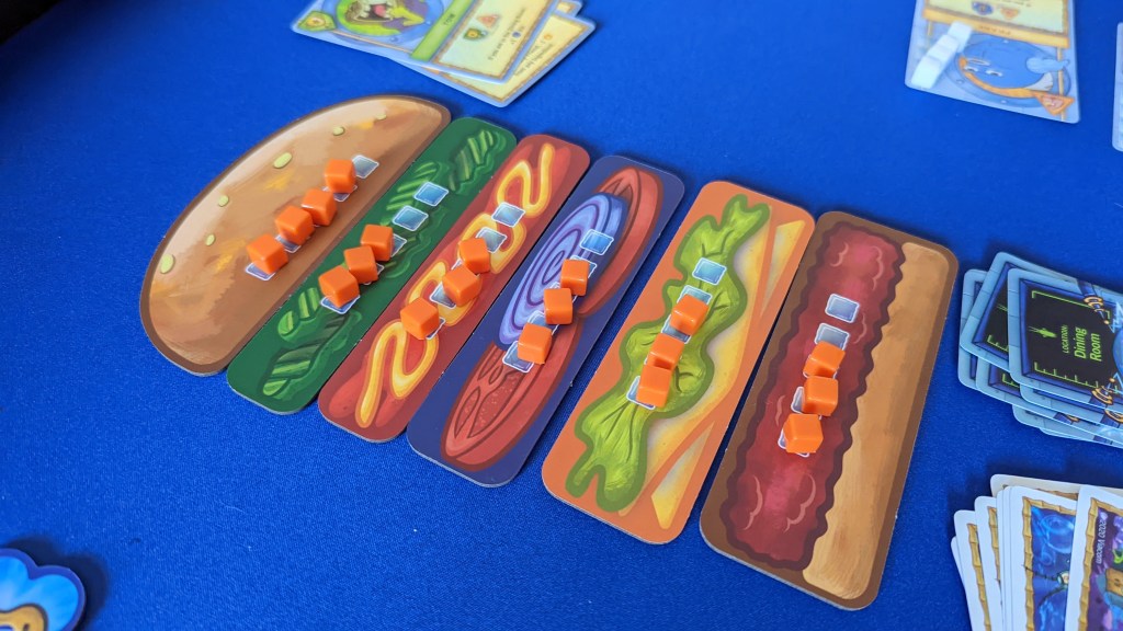 Each of the Krusty Krab card types adds a challenge to the game. Friends and villains can both have Time Counters added to them (white cubes). For Friends, the amount of Time Counters that would fill the card vary depending on Friends, usually they have about three to five slots. The Villain and Orders also add additional challenges, for example, Bubble Bass says “If Plankton is present, +1 [time counter] to each Friend on your team”. There are similar consequences on the bottom of the order cards. We found that the Time Counters add up very quickly and we needed to actively try and get rid of them.