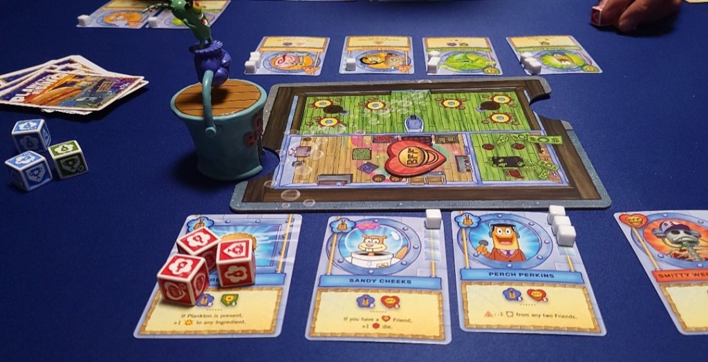 Each person chooses their main character (Spongebob, Patrick, Squidward, or Mr. Krabs) and takes their corresponding Team Deployment Token and Team Home Base card. The Home Base cards show each character’s unique ability (usually if you roll 1 of your deployment icon you’ll get a bonus, or on your first roll if you roll 3 + of that icon you’ll get an extra good bonus). Dice are shared like in other Rising games but your Home Base card says which colors are your main dice. You can earn more dice to roll in addition later via Friend cards you’ve collected. Each color die is more likely to roll a specific icon than the other colors, so it can be strategic later on to try and collect more dice of specific colors.
