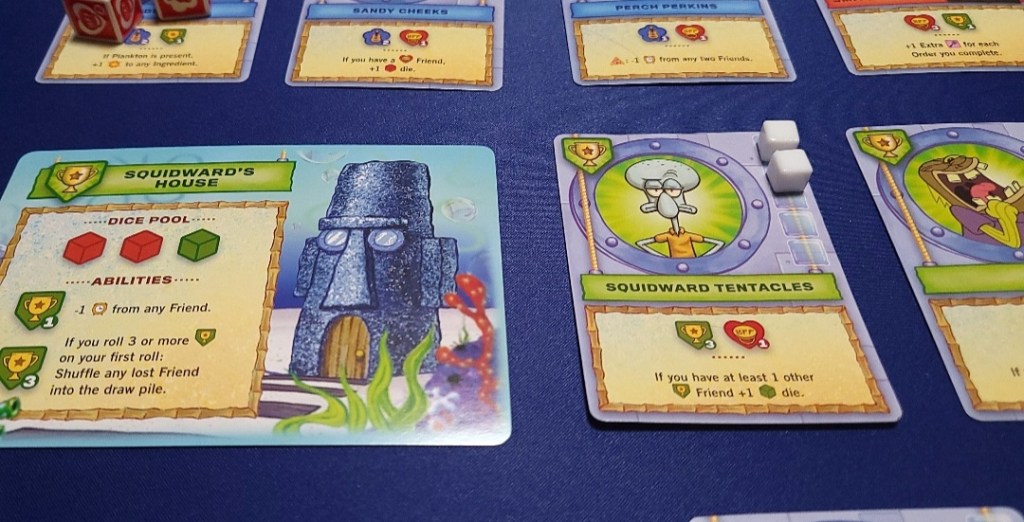 One way to get rid of counters is to use the Home Base card abilities. Spongebob’s house lets you “-1 [time counter] from any Friend” for 1 Teamwork token assigned to the card. All players have a way to remove time counters on their Home Base cards, which is very helpful, If you were to roll 3 or more Teamwork tokens on your first roll for Spongebob’s House, you could remove “-1 [time counters] from any two Friends” which is great because you do not need to assign those dice like you need to with Spongebob’s first ability and it helps multiple Friends. These can be Friends you’ve collected, Friends on the board, or Friends collected by other players. Of course the second ability that is more powerful is much harder to achieve but it is possible.