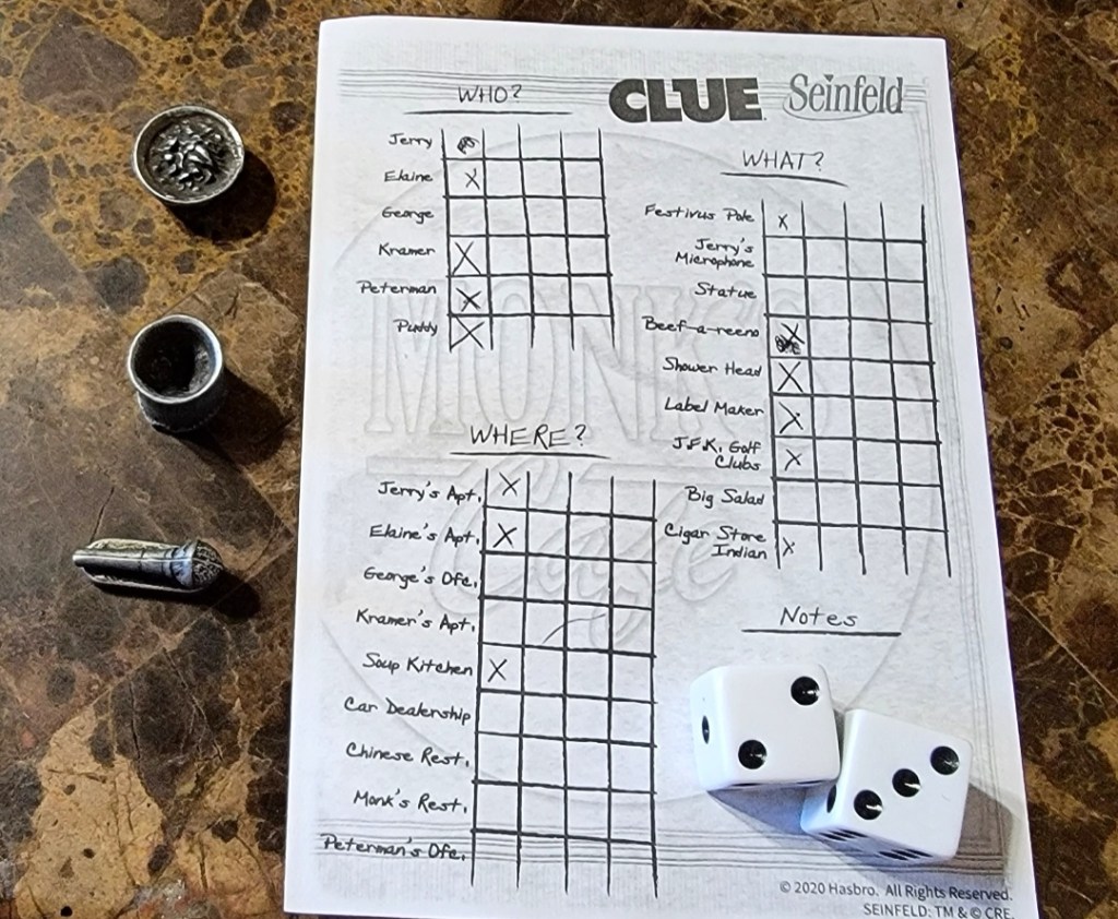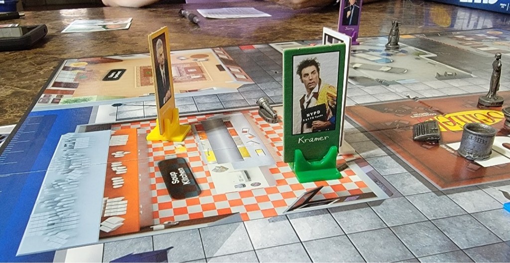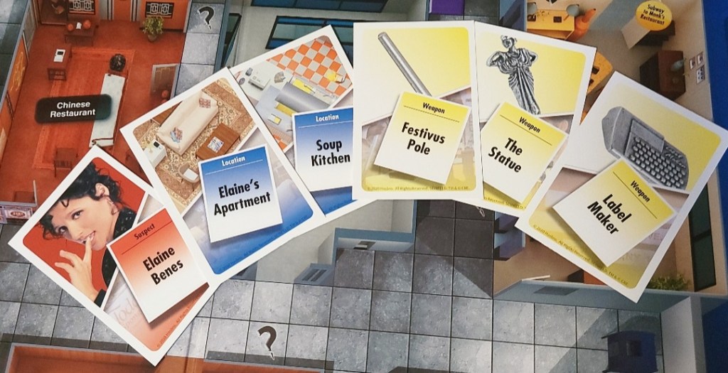 Gameplay is almost identical to the original Clue. You roll dice, make a guess, and any information that is wrong with you is shared in turn order. Seinfeld Clue differs slightly in some of these steps however. The dice and the board contain “?” Icons that will make you gain an intrigue card. Intrigue cards serve as a bonus card, giving you extra steps on your rolls taking an extra turn or additional bonuses. Rolling the “?” will automatically give you an intrigue card, and if you step on a “?” on the board your movement ends and you gain one as well. On a regular roll (one without “?”), you may move up to that amount in orthogonal directions only. There is no rule that clarifies if you take your movement from a “?” roll so we played with the rule of you take whatever the other die reads.