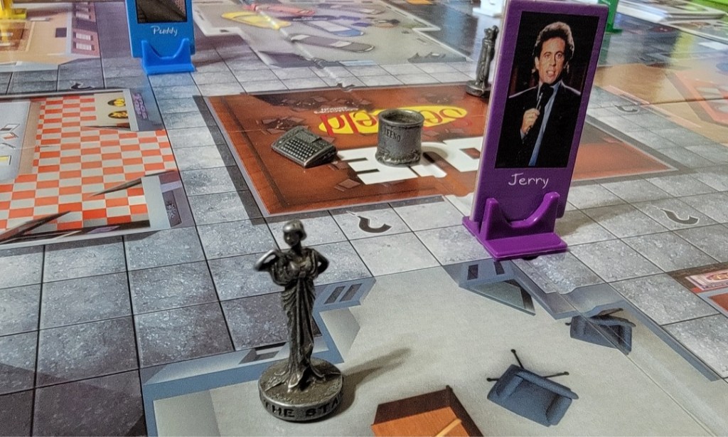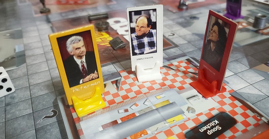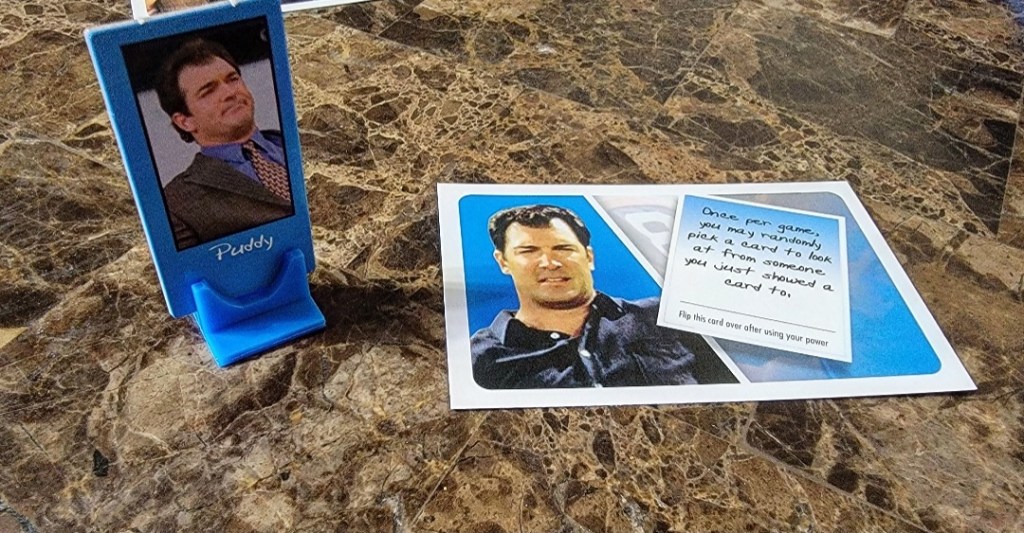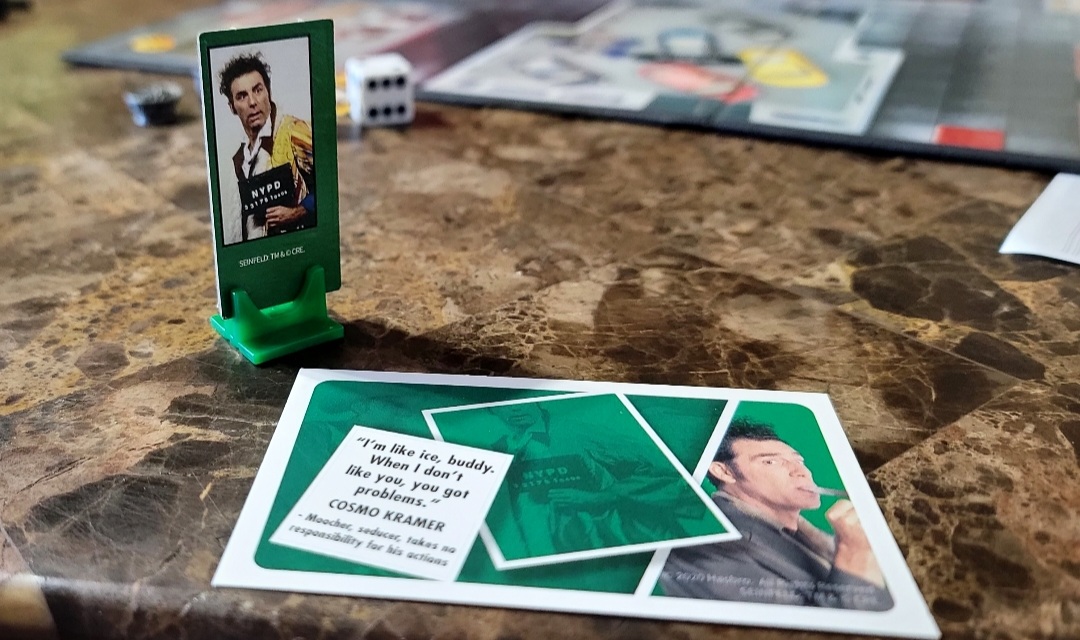 Artwork: Decent. The character cards and standees for Jerry, Elaine, George and Kramer(the four main characters) are very high quality. They are crisp and clear. Peterman’s card is slightly pixelated and Puddy’s card is very pixelated and looks like it was pulled out of a screenshot rather than a photoshoot. The weapon cards are also slightly pixelated making the details of the tiny items seem much more pronounced than they actually are.