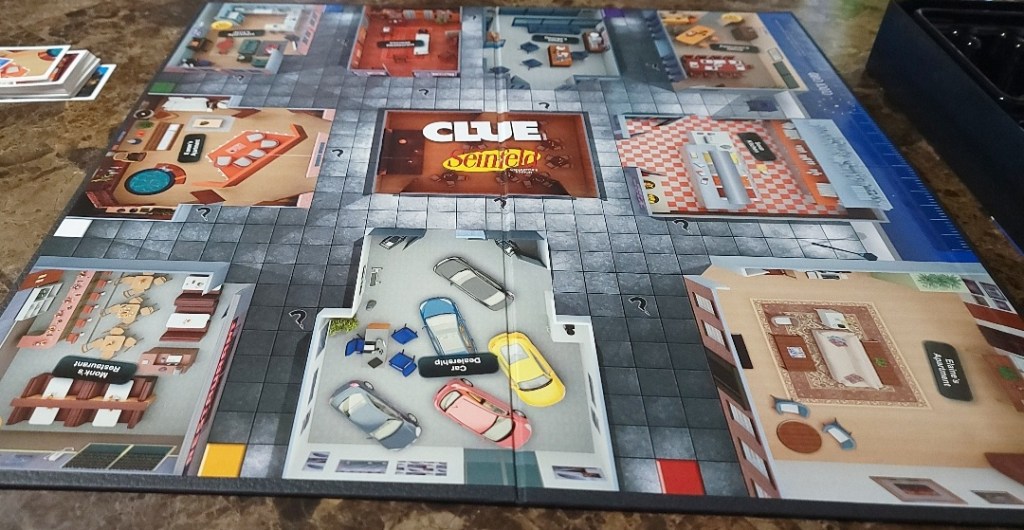 We were gifted Seinfeld Clue by The Op Games to review. Seinfeld Clue is a refresher version of the classic game Clue, with some minor changes in rules and some big changes in theme. If you are a big fan of Seinfeld then every homage to the game and its lore will be a happy detail for you as you play. The game does a great job of incorporating the theme while also maintaining the easy playability of the original Clue. Even if you are not familiar with Seinfeld, the game is fun and easy to play. In this game, Newman has some dirt to spill on the characters in the form of a newsletter he intends to send out. Someone has knocked Newman out and hidden the newsletter somewhere in the city. It’s up to you to find out who knocked out Newman, with what weapon and where they hid the newsletter.