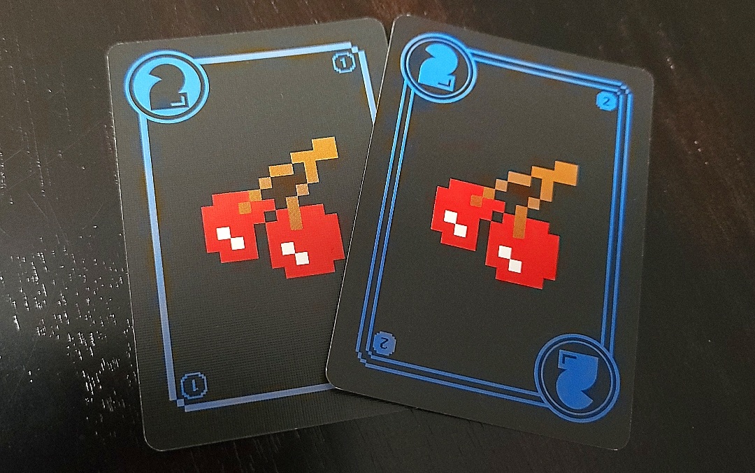 After deciding which level you want to play, you shuffle the appropriate deck/s. The decks are easy to separate as they have an icon on the top right corner that symbolizes which deck they belong to. There is a pixelated dark 1 and a pixelated blue 2 that makes them easy to separate before play. The first player is the person who can make the best PAC-MAN impression (we weren’t sure if it was the classic “waca-waca” or the death “byooo-eh-eh”). Once that’s been decided the first player will take their turn by drawing up to 3 cards. There are three types of cards you can draw: dots/fruits which earn you points, ghosts which are strikes, and power up cards which have varying results. You draw your cards one by one and may stop after any amount up to 3. So you may draw 1, 2 or 3 cards. Your goal is to draw as many fruits/dots as you want as they earn your points. After drawing a card you may continue to draw cards up to the maximum of 3 per turn, end your turn or shut down. If you decide you end your turn, you will continue next turn but if you decide to shut down you will no longer draw cards until the game is over. The artwork is the simple pixelated fruits and labyrinthine walls of the classic arcade game. There are no drawbacks to obtaining dots/fruits cards. Dots are the most abundant cards and are low scoring. There are less fruits than dots but they are higher scoring.