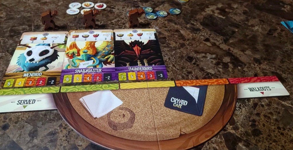During phase four, you collect your servers and your unfed monsters are moved to the right 1 OR 2 spaces. As they move to the right, they will have been waiting longer and will be less likely to leave a good tip. (Just like real life, no one likes to wait a long time for their food.) The green slots will net you the most amount of points, the orange the second most and the red the least amount of points. If you manage to not feed the cryptids by the time they reach the end of the spaces, they will give you negative points at the end of the game. You may be wondering why you would want to move 2 spaces instead of 1. The answer is that after moving your monsters, you refill all the green slots on your turn. So if you decide to move 2 slots you’d refill 2 slots, giving you more opportunities and options for feeding at the cost of making other customers potentially unhappy. After cleanup, the next round begins and the round token is moved, and the first player card (the slime and pepper) goes to the next player. Players continue through the appropriate number of rounds until the game is over.
