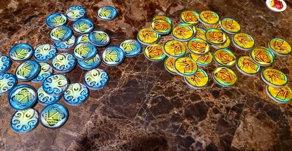 Phase two consists of sharing tips and collecting food. Each line is solved one at a time. To share a tip, you will give some money to the chef to… well… cut in line. It pays to be first but it can also cost to be first. If you share your money you get to be first because money makes the world go round. Even in the cryptid world. Once you have moved up in the world (and line) you bump everyone back and the line is solved. You can only share your tips once per round, so make sure you share at the most critical time. As a house rule, we added the possibility of competitive tip sharing. Meaning that if someone paid to bump you back, you could pay to bump them back. It added a nice auction-like mechanic to the game they made it a very competitive game. After tips have been resolved you simply collect however many food tokens pertain to that line and you repeat for the next lines. Once all lines have been finished, phase two is over.