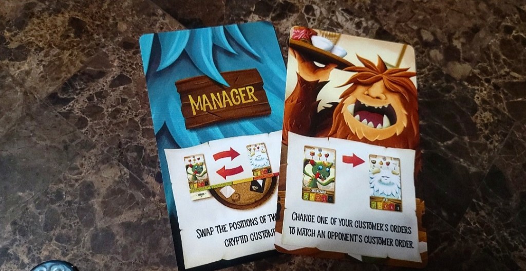 There are two bonus card that each player starts with. The manager card allows you to switch the order of any two monsters in your lineup. This lets you gain more points if needed or helps avoid harsher penalties for not feeding cryptids. The Change My Order card lets you swap a monster’s order with any other unfed monster. This lets you use cheap monster’s order to fulfill higher scoring monsters. There are also penalty cards that may be drawn during the cleanup phase. The penalty cards affect everyone and will make a specific ingredient unavailable or make your line move 2 spaces at the end of the game.