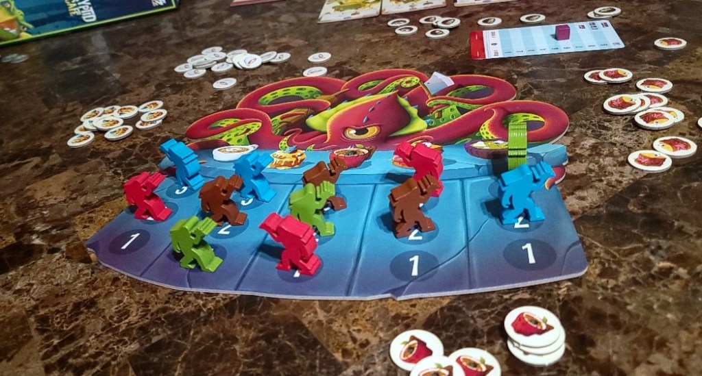 The first player is the person who most recently went out to eat. On your turn, each player will perform phase one, then phase two, phase three and finally phase four. To begin phase one, you simply look at the Kraken’s chef table and select where you want to go. There are 5 lines (one for each ingredient) and 3 spots in each line. If you are the first person in line you will get 3 food items at the end of the turn (pending a few other things). If you are second you will get 2 and if you are third you get 1. It pays to be first in line. Each player will continue to place their servers in whichever line they want (and can). Once all players have placed all 3 of their meeples, phase one is over.