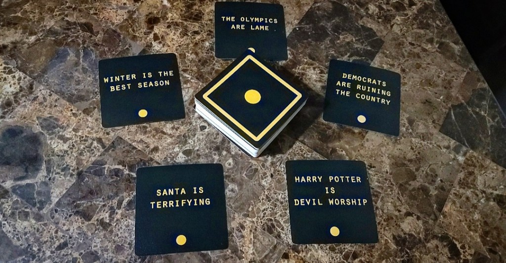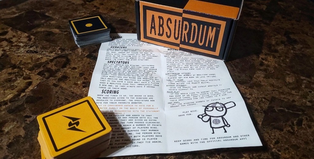 When the timer is up, the player who has the most convincing argument is the winner and earns a point. Play continues until a specific point amount is reached. There is no requirement to play by points, with a timer, or to a specific point count. You can play for however long and debate for however long you’d like. The game can get very absurd very quickly. Which explains the name…