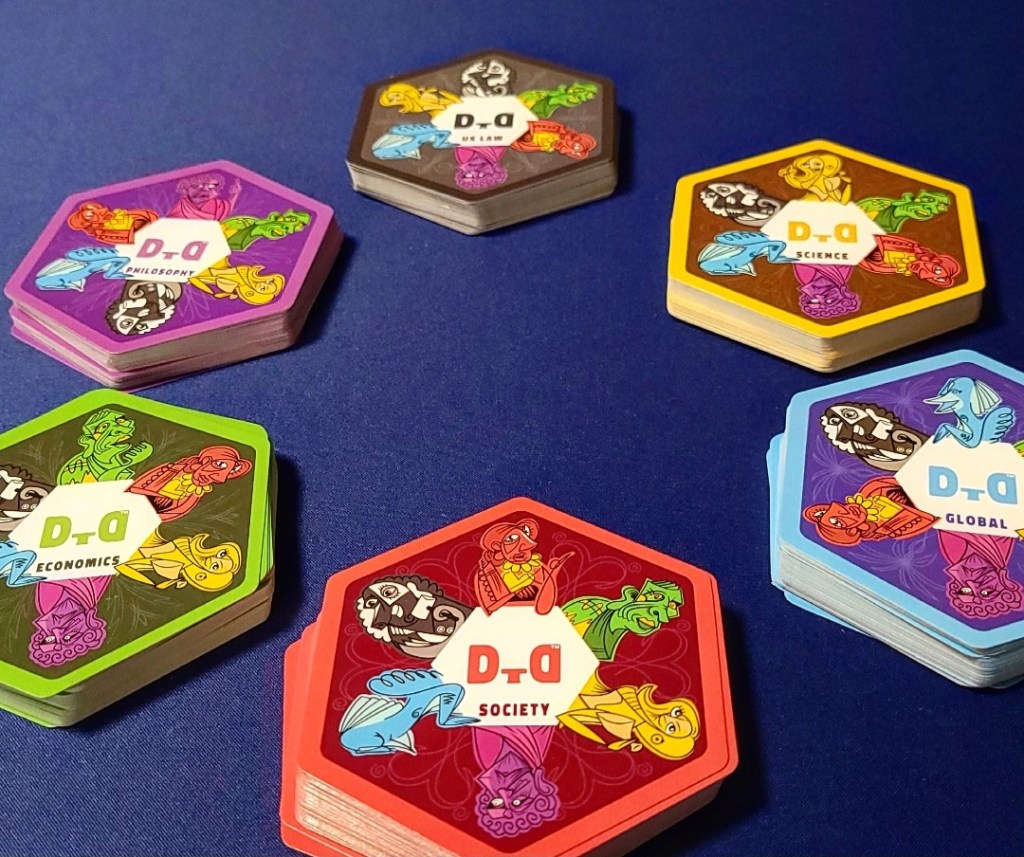 Artwork: Neat. The design is simple and clean with artistic linework. The bright color of the cards is both appealing visually and helpful in separating the cards by category. The logo is especially notable as it is two letter Ds facing each other at a table.