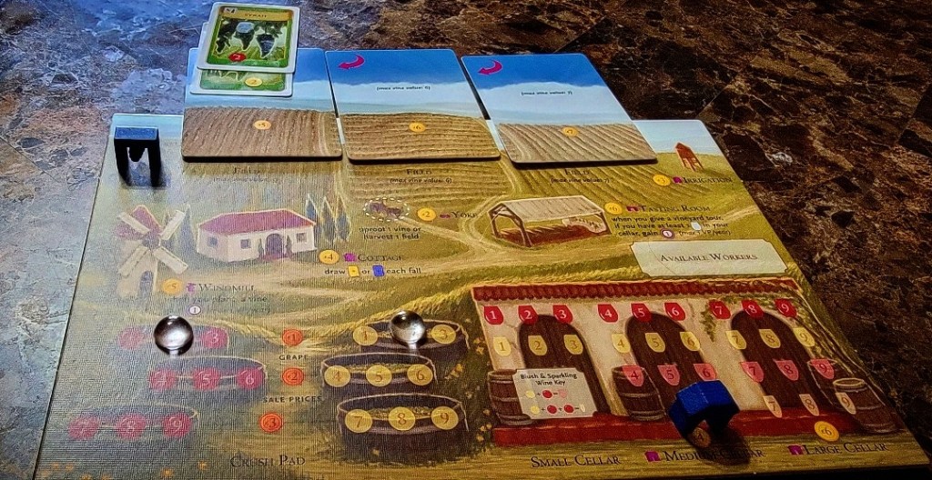 Once all players have taken their turn the year ends. To end the year any grapes are aged and any wine is aged up to it’s maximum. Grapes will move 1 space higher. A 4 to a 5, a 5 to a 6 etc. Wine will also move up 1 space higher up to the players cellar maximum. Your maximum at player start is 3. Building a medium cellar will allow up to 6 and a large cellar up to 9. They also allow for blush and sparkling wine, respectively. If a wine or grape is already at it’s maximum then it simply remains where it is. A 9 will stay a 9 or if a player only owns a medium cellar a 6 will stay at 6.