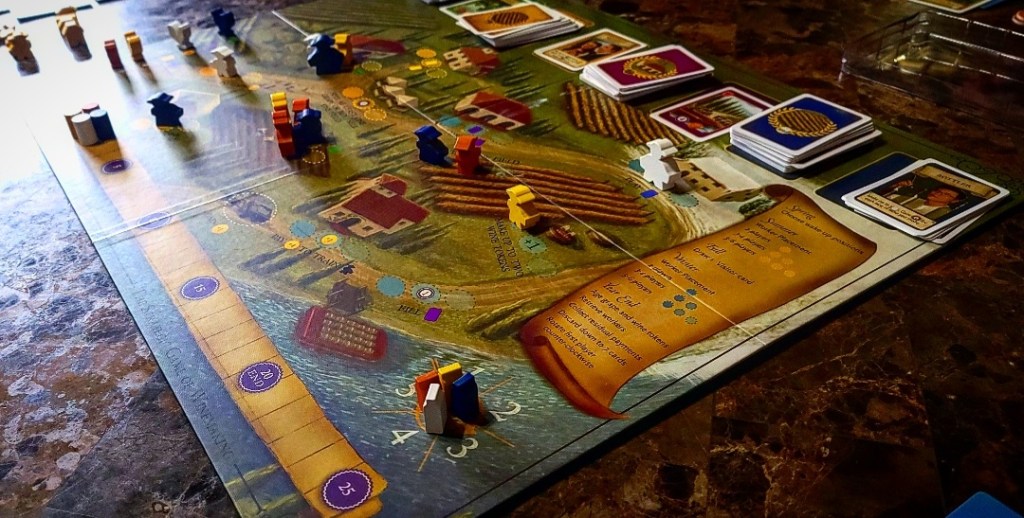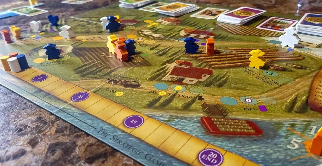Strategy: Moderate to high. While this is a heavier game it does not feel heavy. You can attempt to block people’s actions to further your own agenda but it’s not entirely an appropriate strategy. Playing aggressively in this game is allowed but it most likely won’t benefit you to purposely close off actions to simply close off actions. Since a player can still use their large meeple it doesn’t always help to block off goals. The game really comes down to how efficiently can you use your turns to make wine.