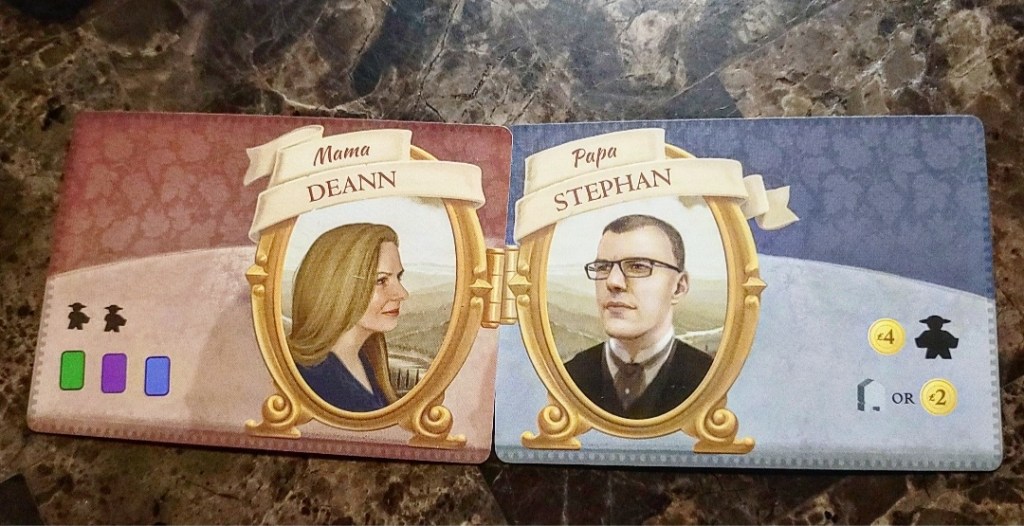 In order to setup the game, you shuffle the various types of cards. The cards are easily distinguished by their colored backing that has a unique art piece for colorblind players as well. There are vine, wine order, summer visitor and winter visitor cards that will be placed at the top of the game board once shuffled. Each player will get a mama and papa card that will determine their starting conditions. Some cards may start the player with a building OR lira and a certain number of wine/wine order/visitor cards. Finally, every player will get 3 field cards that will be placed face up on their player mats; the back of the cards will say “SOLD.”