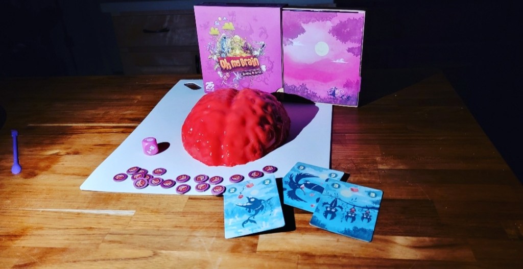 Artwork: Fabulous. The pink/purple color scheme was distinctive, the cubed brains were unique, and the different designs that incorporated the cubed brains were so fun to look at. The game had a lot of art appeal that makes it excellent to display on any table. It also helps with our year-round Halloween craving.