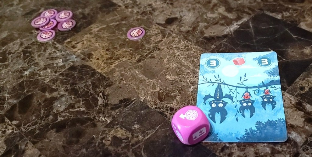 The cards have normal numerical values on them but a few have special abilities. The 0 can be played at anytime no matter what number is played. When an 8 is played, the next player has to play a card with a value less than 8 and then play resumes normally. When an 11 is played the active player can get rid of the current stack of cards and play another card of their choice. You can also combine cards of the same number and their value will be that number multiplied by the amount of like cards played. When you do this, you place one card on the ongoing stack and the rest in your opponent(s) graveyard(s) (it can be multiple). This feels awesome when accomplished but is harder to do than one would think. Another special ability that can be on various numbered cards comes from a square brain icon centered on top of some of the cards. When these are played, the active player will roll the brain die and do whatever it says. Most of the time this results in a brain token being earned (either taken from the main pile or another player), switching hands with an opponent, putting cards in an opponent’s graveyard, all of which have a positive affect for that player. However, you can roll the icon which makes each player draw another card for their graveyard, which no one likes! This makes the game more even overall though.