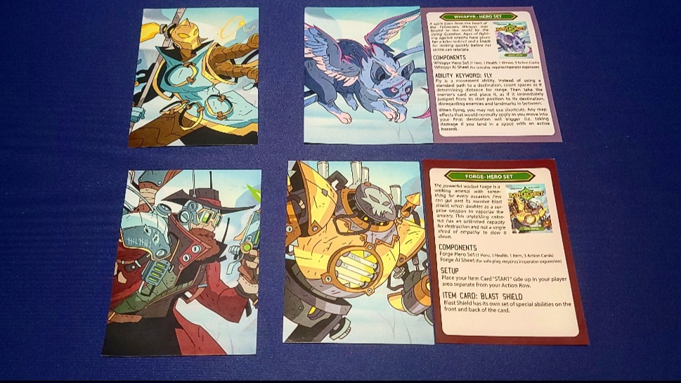 Different hero sets have different types of abilities, like Akhena’s Fate-Bringer, Mutiny’s Dead Reckoning, Whispyr’s Silent Wings, and Forge’s Blast Shield. AI sheets add additional elements for the sets for solo play as well.