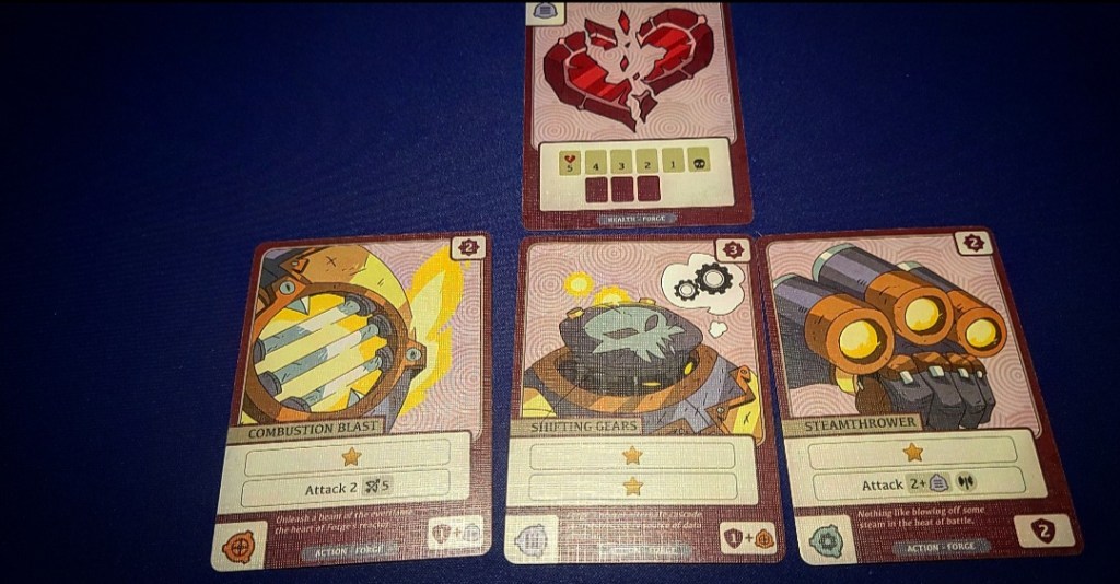 Players will also each create an Action Row with their action cards placed in a row and their Health Card above the Action Row at full health. This was a unique mechanism that we really liked as the Health Card moves along this row it is a brilliant way to keep track of health.