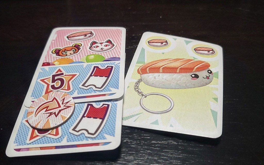 Artwork: Adorable. The toy theme is exemplified with the toy dispenser images and the keychains hanging off of each Gasha image. The bright colors pop, but nothing on the cards is overwhelming.