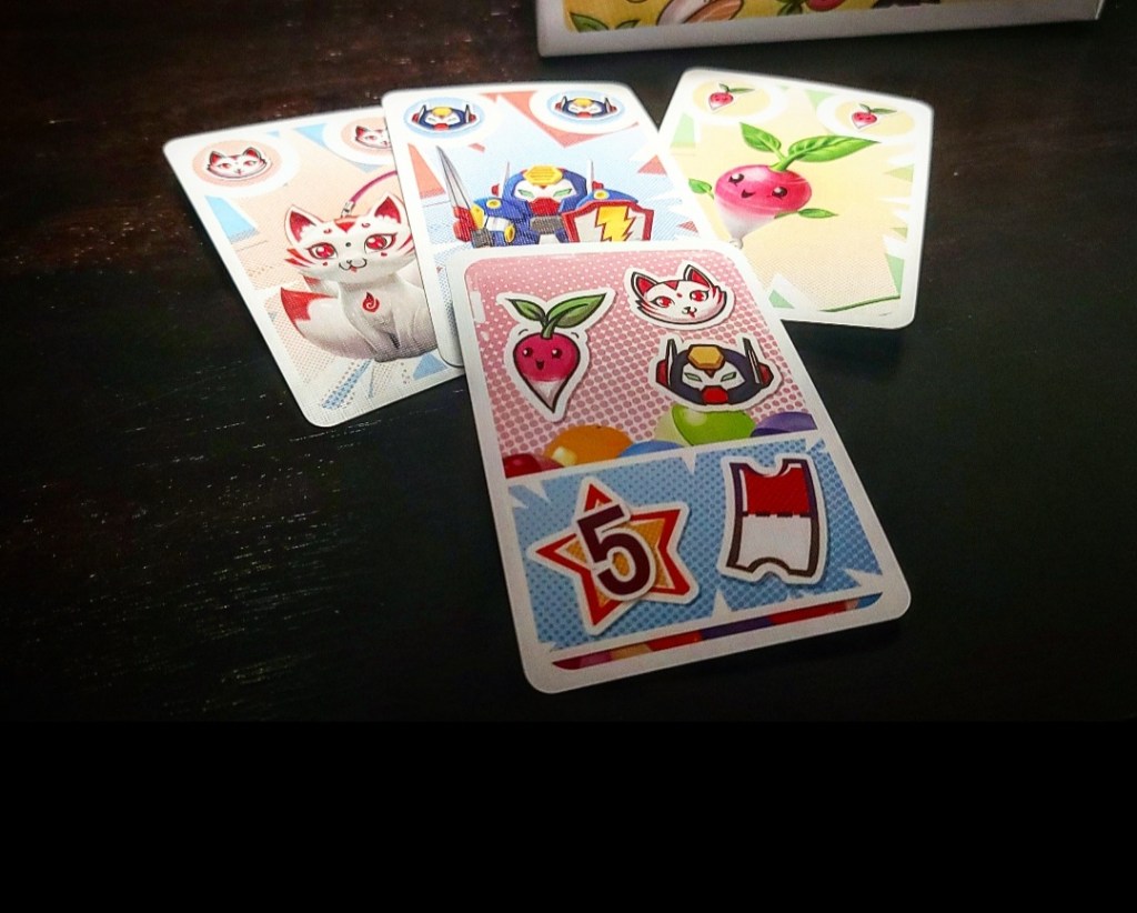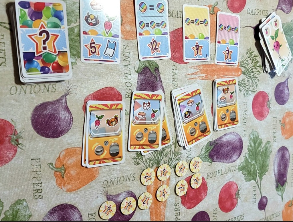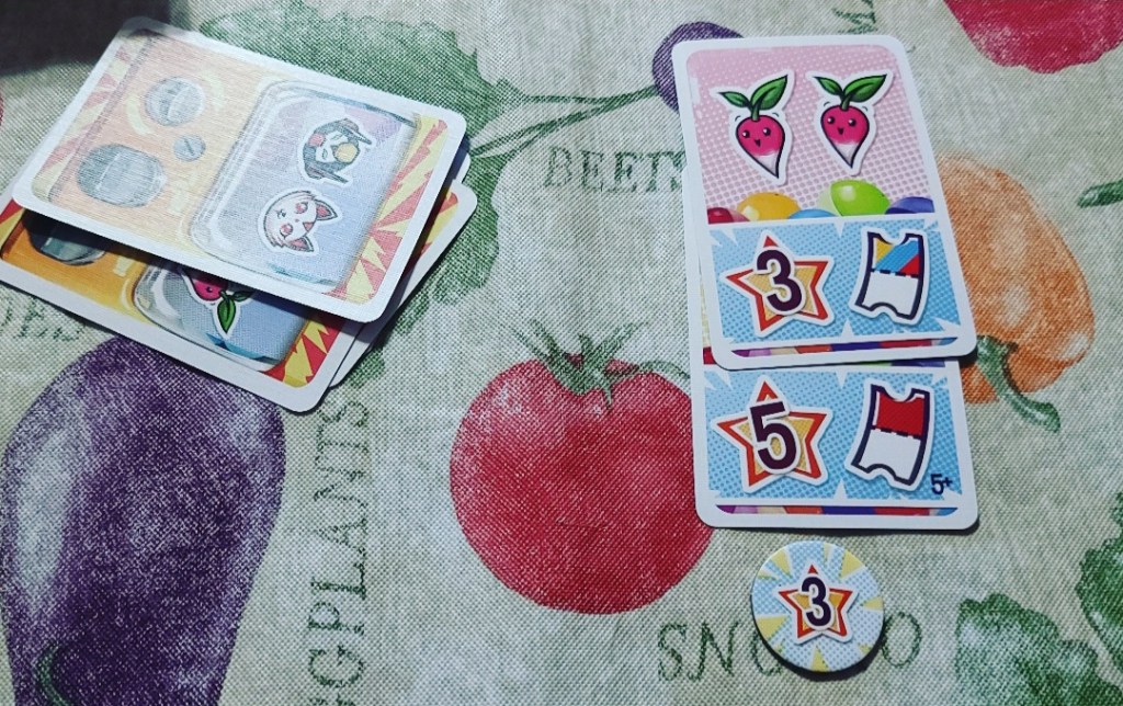 Scoring is simple, players add up all the stars on their Set Reward Cards and bonus tokens and get one additional point for each Gasha in their hand that they haven’t played. First place goes to the player with the most points, or if that ends in a tie, the owner of the most bonus tokens between the tied players wins.