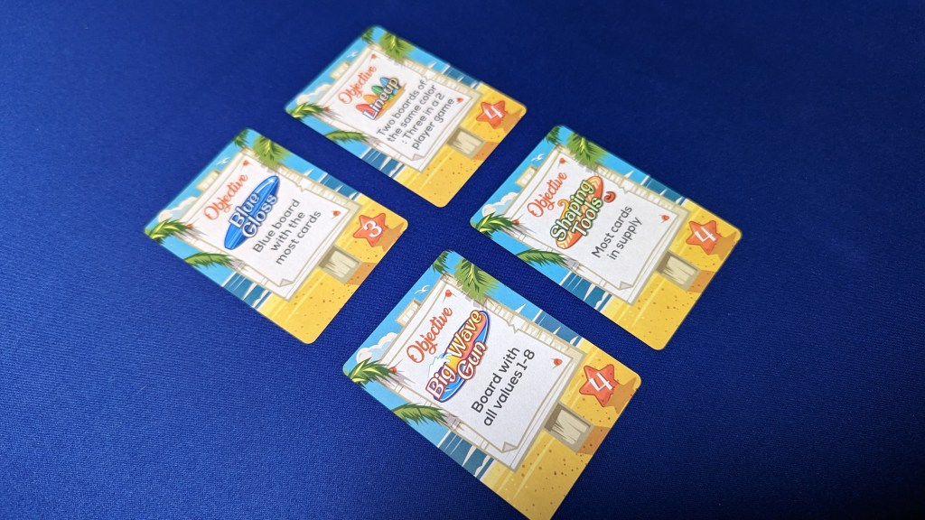 To set up the game you simply shuffle all board cards and lay them face down in a stack, shuffle all objective cards and place them face down in a stack, the optional beach cards can be placed face down within reach or left out. Next, all players will draw 2 board cards and place them in front of themselves as their starting hand (the player with the lowest overall value is the starting player). Next, 4 objective cards are drawn. These cards will serve as every player’s goals for the game. Objectives range from having specific color boards to using no wild cards in your board. They give a nice range of objectives to keep strategies different during each playthrough. Beach cards are optional and are only used to mark a board that has been completed. They serve no other purpose other than to serve as a reminder that you have completed a board.