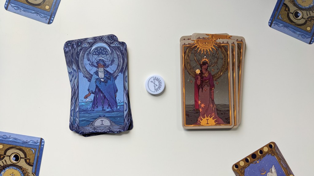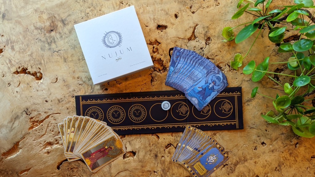 Artwork: The artwork is gorgeous and what makes this game really stand out on the table. The Nujum cards are boldly decorated in their rich blue moon theme or golden sun theme, and the Eclipse cards encapsulate both color palletes. The playmat has simple, elegant sun and moon designs which make the more decorative cards pop when they’re placed nearby.