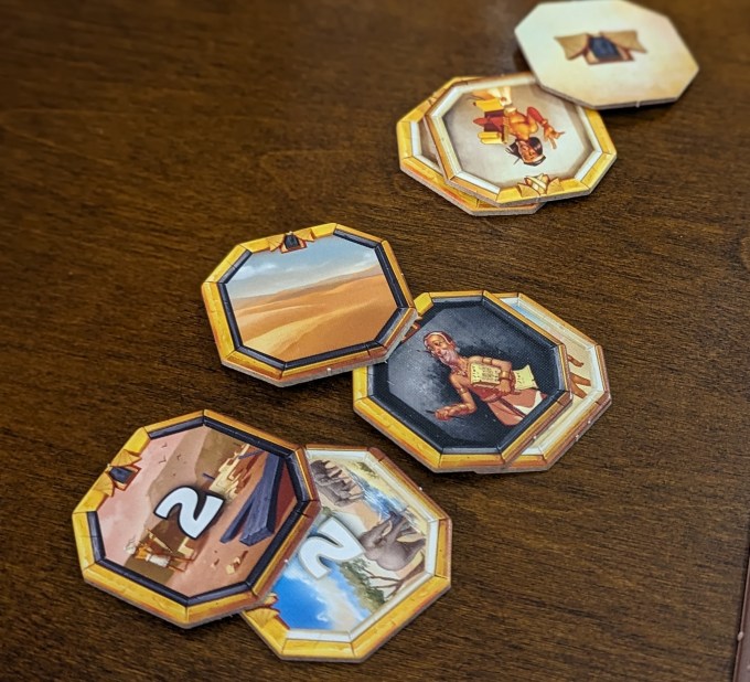 Artwork: Beautiful. The designs are like modern drawings of ancient Egyptian themes. The color scheme pops and also makes the tiles easy to sort for scoring.