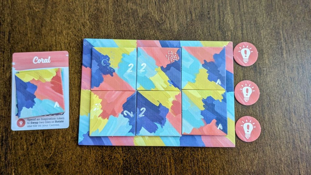 Strategy: Great. There is an element of luck to which cards you’ll have to choose from but that’s balanced well with the amount of turns you get to change your cards out and the inspiration tokens to move things around further. Your strategy lies in both the initial placement and the limited amount of inspiration tokens to spend on swapping/turning tiles.