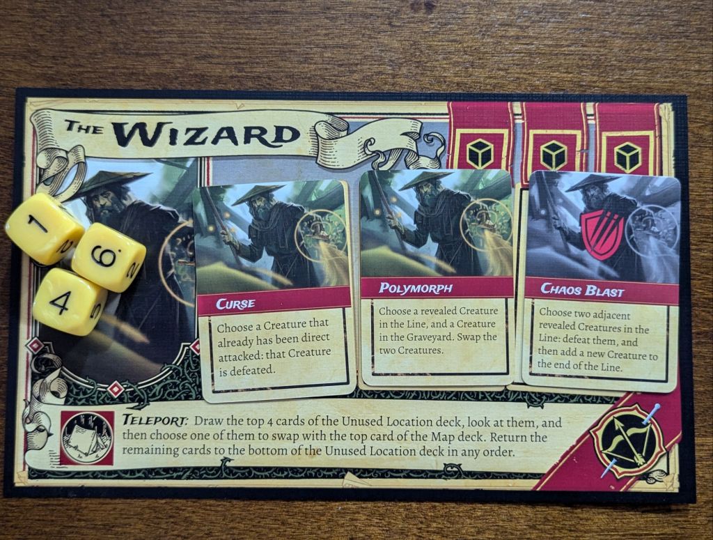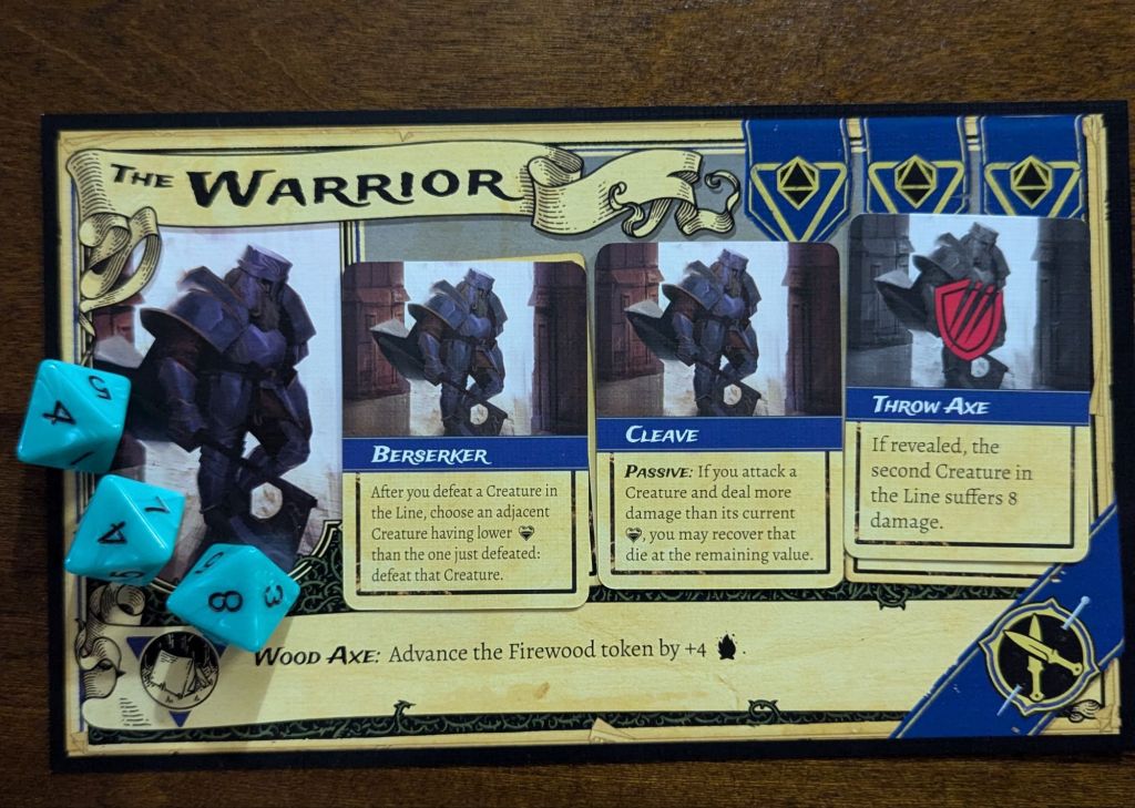 Strategy: Moderate to heavy. Depending on the difficulty the game can be a moderate challenge or a serious challenge. You must decide who will stay at camp and realize that they will be unable to do a whole lot this round, aside from healing you (if you’re lucky enough to roll exactly a 6 on one of your dice). You must then decide which order and which abilities, if any, you’ll use for that character. Hopefully you’ll survive the round without losing anyone. It’s a tough game and very unfair at times. You’re usually fighting a losing battle.