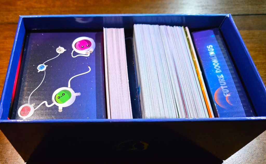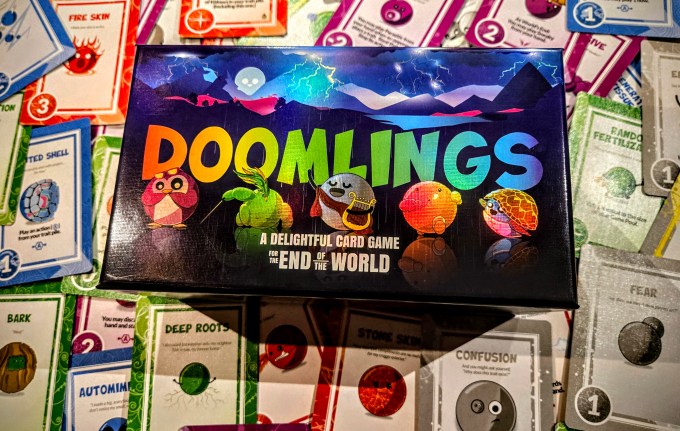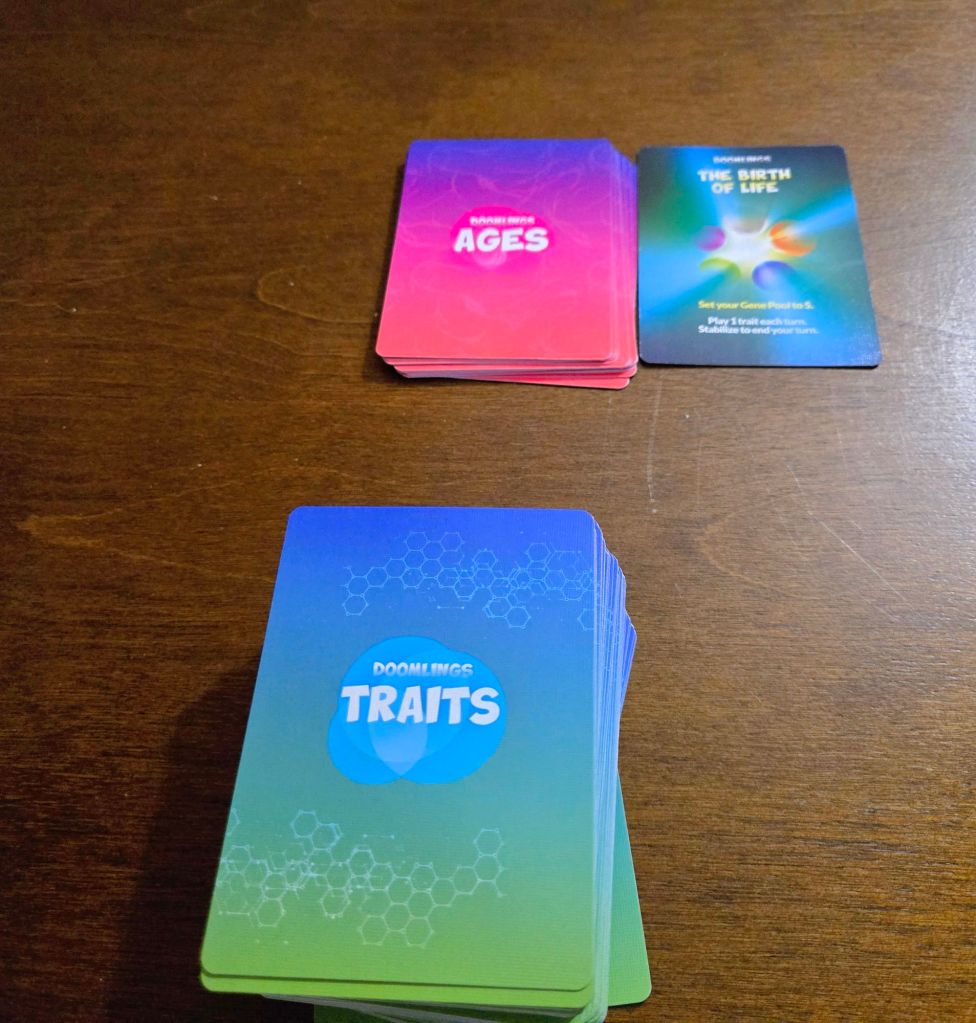 Doomlings is a competitive card game where you try and expand your traits from the beginning of life to the world’s end through the cards you play. The person with the most points at the end wins.