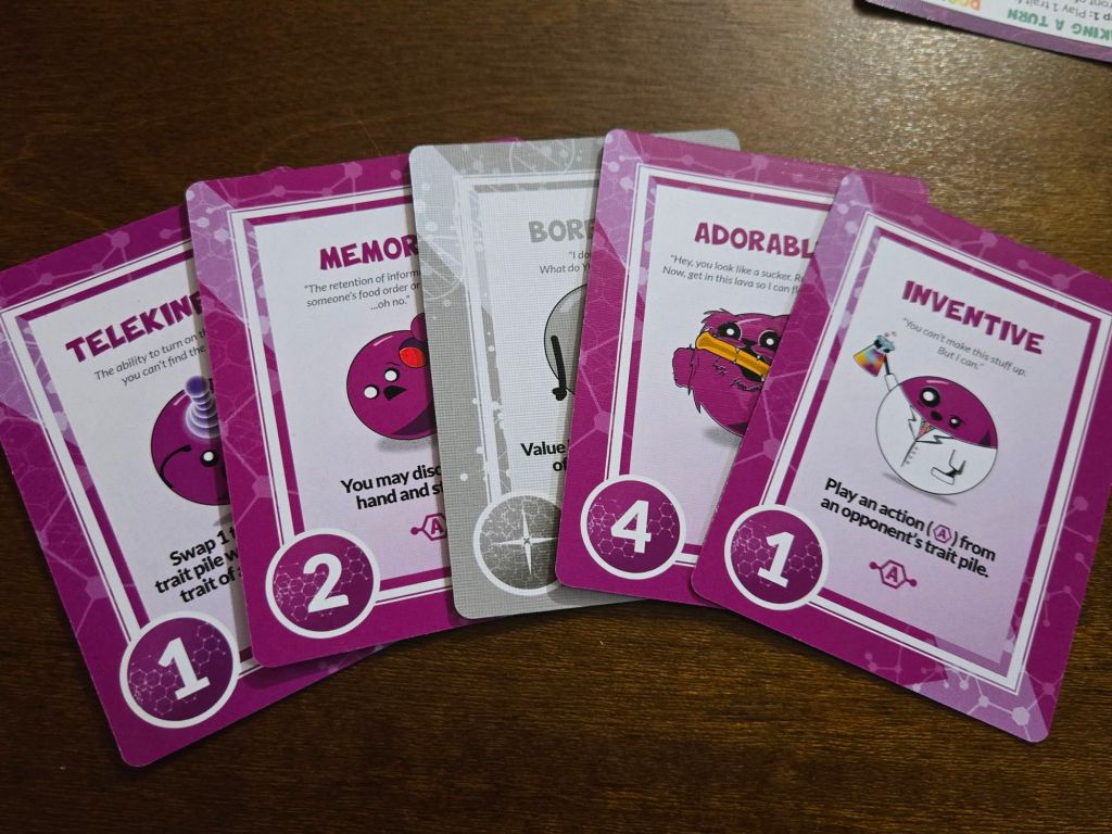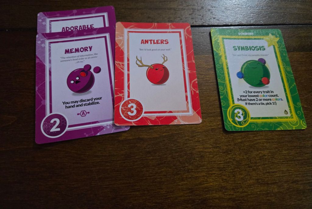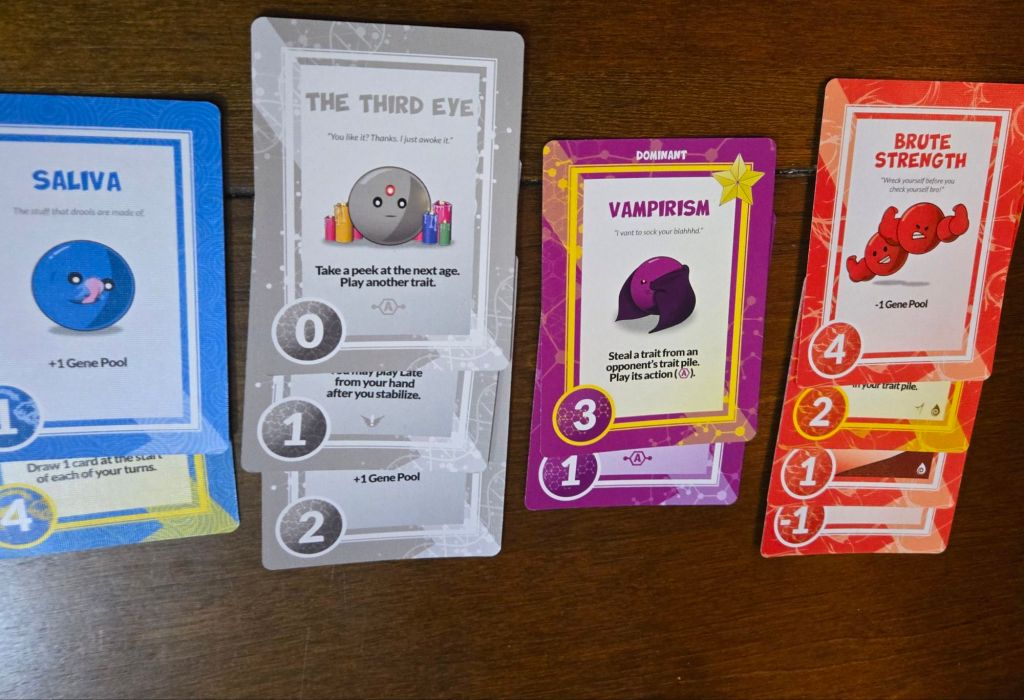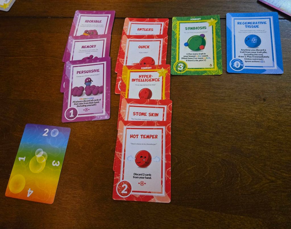 Strategy: Somewhere between light and medium. We often say with card games that it is the luck of the draw, and that’s here too, but the variety of cards that come up allow you to strategize a little more extensively. You can choose to play more offensively or defensively with many of the cards. Sometimes you can take away traits from others. Or you can play abilities that will benefit you immediately or at World’s End in the final round. Having these options made it feel like the strategy had more weight.