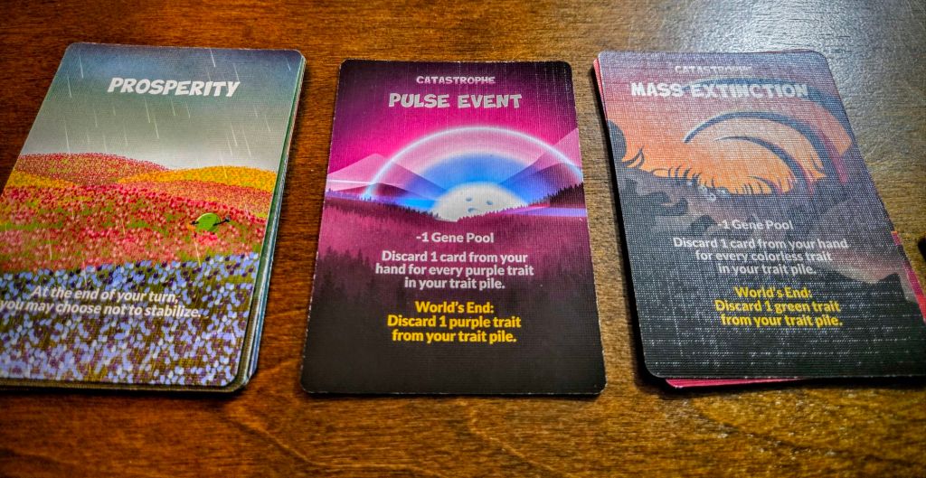 Artwork: Cute, colorful, emotive spheres are the heart of Doomlings. They look kind of like web comic art. Most of the card design is a colorful trim around a cartoony circle. However, cards like the Catastrophe or Prosperity cards feature full color background scenes that are gorgeous. The backs of the cards are all beautiful rainbow-y designs and the cards that tell you how large your gene pool (hand) can be feature different rainbow gradients for each player. There are a lot of lively elements to the design, which is perfect for a game about expanding life/traits from the beginning until the end of time. All of the various art choices are brought together beautifully on the holographic box cover.